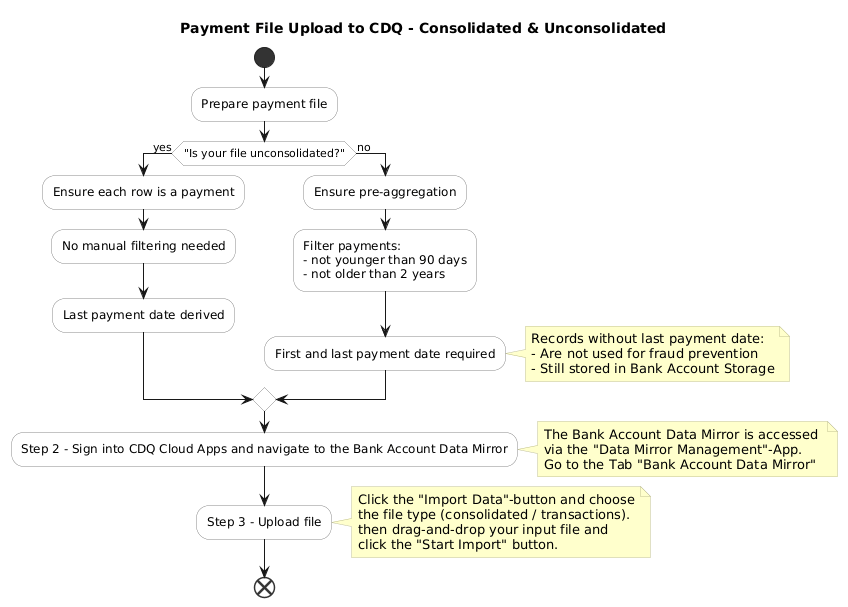 The diagram below illustrates the full process of uploading either unconsolidated (preferred) or consolidated payment files to CDQ. It highlights:
